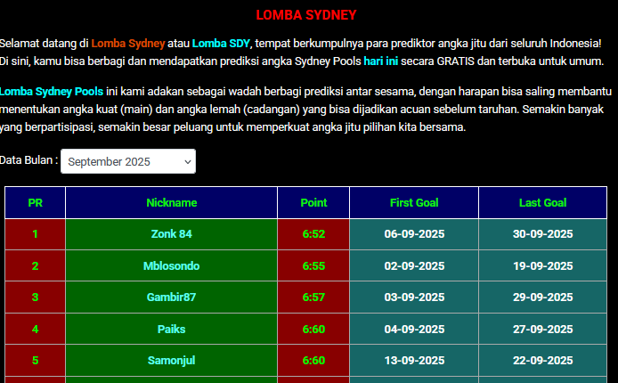 Selamat datang di Lomba Sydney atau Lomba SDY, tempat berkumpulnya para prediktor angka jitu dari seluruh Indonesia! Di sini, kamu bisa berbagi dan mendapatkan prediksi angka Sydney Pools hari ini secara GRATIS dan terbuka untuk umum.